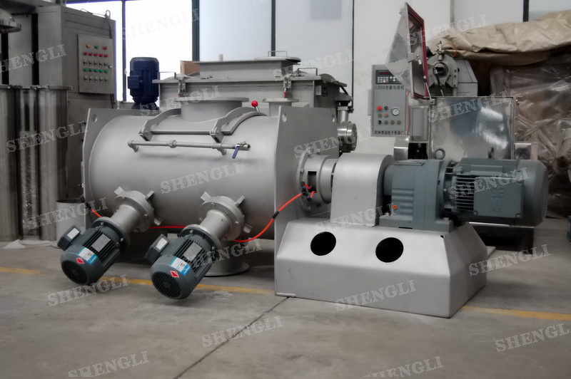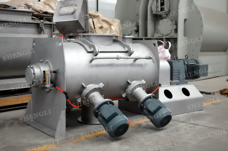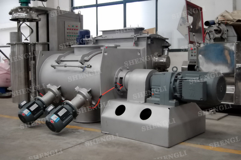 工作原理:犁刀式混合機采用臥式圓柱筒體,內設平行主軸,主軸上安裝若干犁式刀頭,通過較快的旋轉速度,分割、重合物料,實現快速攪拌的功能,常結合1500-3000轉高速剪切飛刀相互作用。